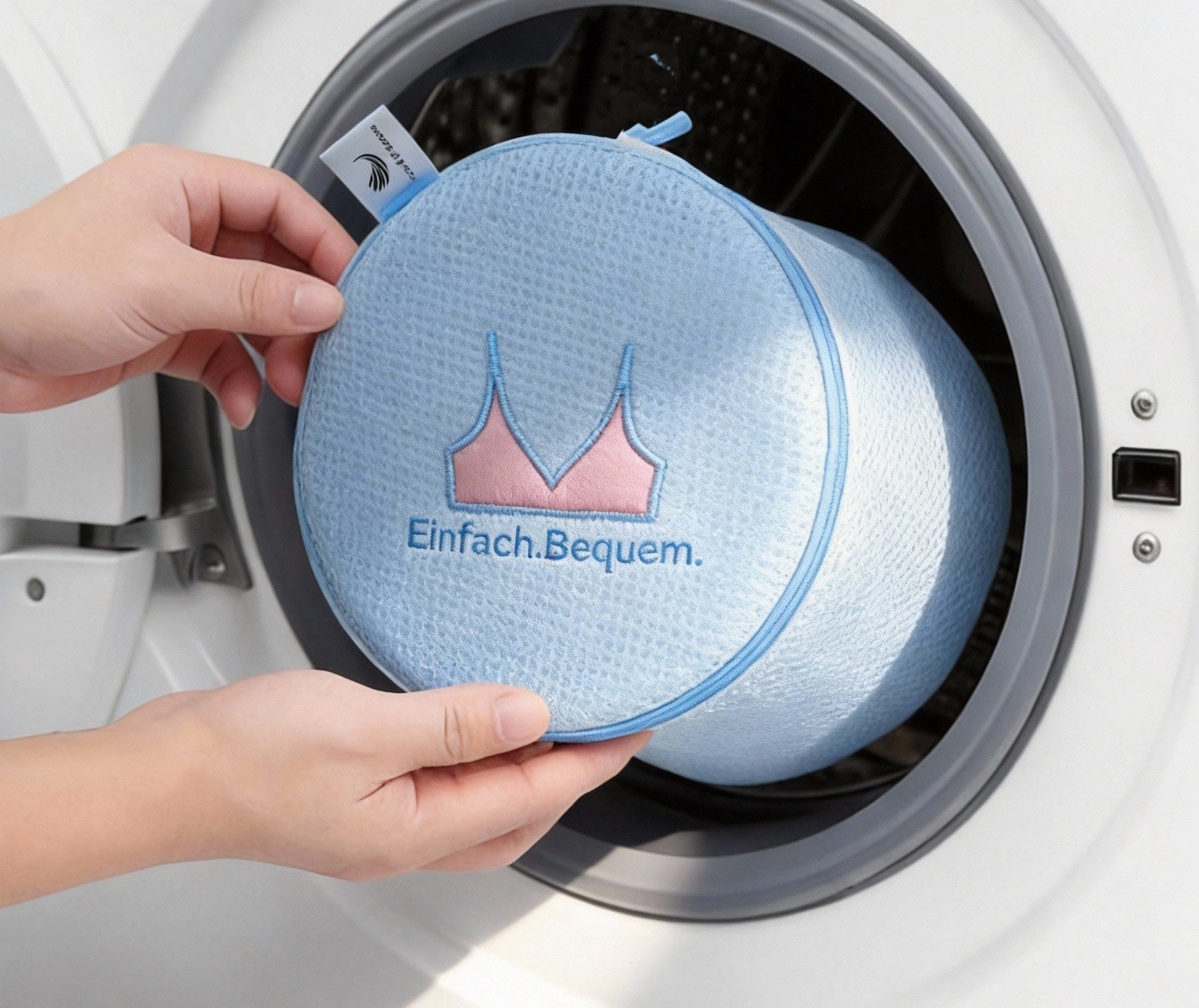Der Wäschebeutel kann zusammen mit weiterer Wäsche in der Maschine gewaschen werden. Ein gut gefüllter Beutel reduziert Bewegungen im Waschgang und hilft, ein Verdrehen oder Knicken von halbfixierten oder herausnehmbaren Cups zu vermeiden.